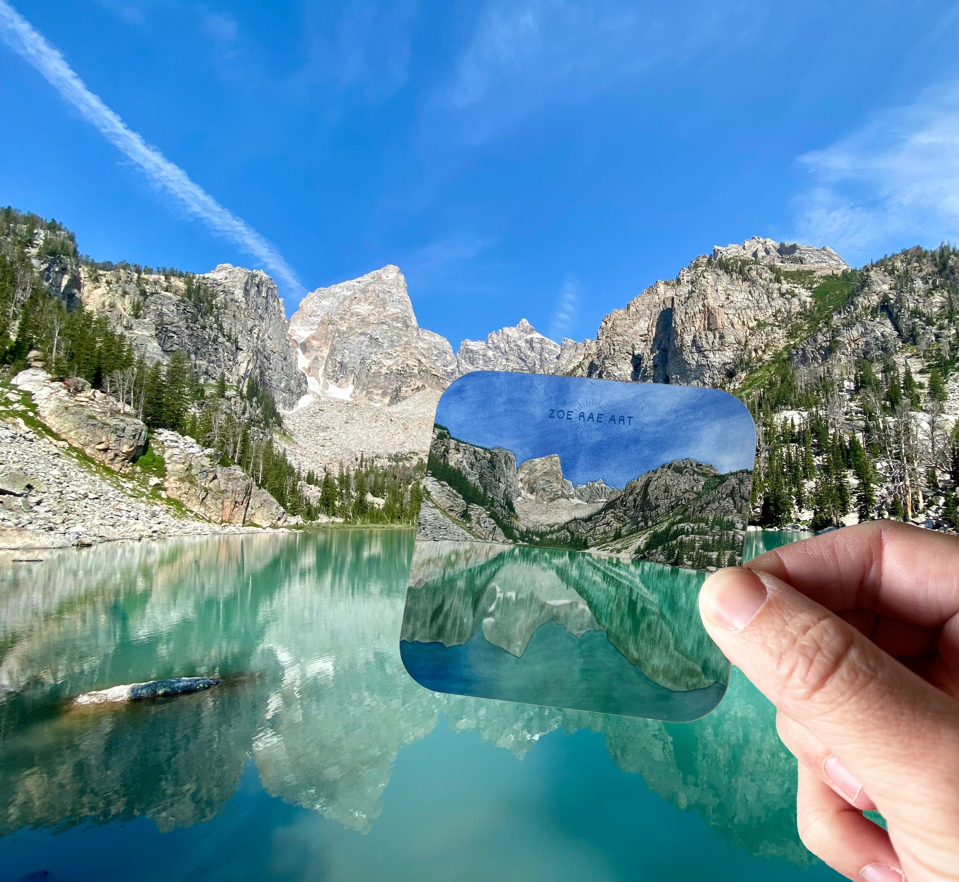 This piece was inspired by Delta Lake in the Grand Tetons National Park. In this print you can see the Grand Teton rising up from the clear teal water of Delta Lake. Bring home the beautiful view and water of Delta Lake to your laptop, car, water bottle, or sketchbook.