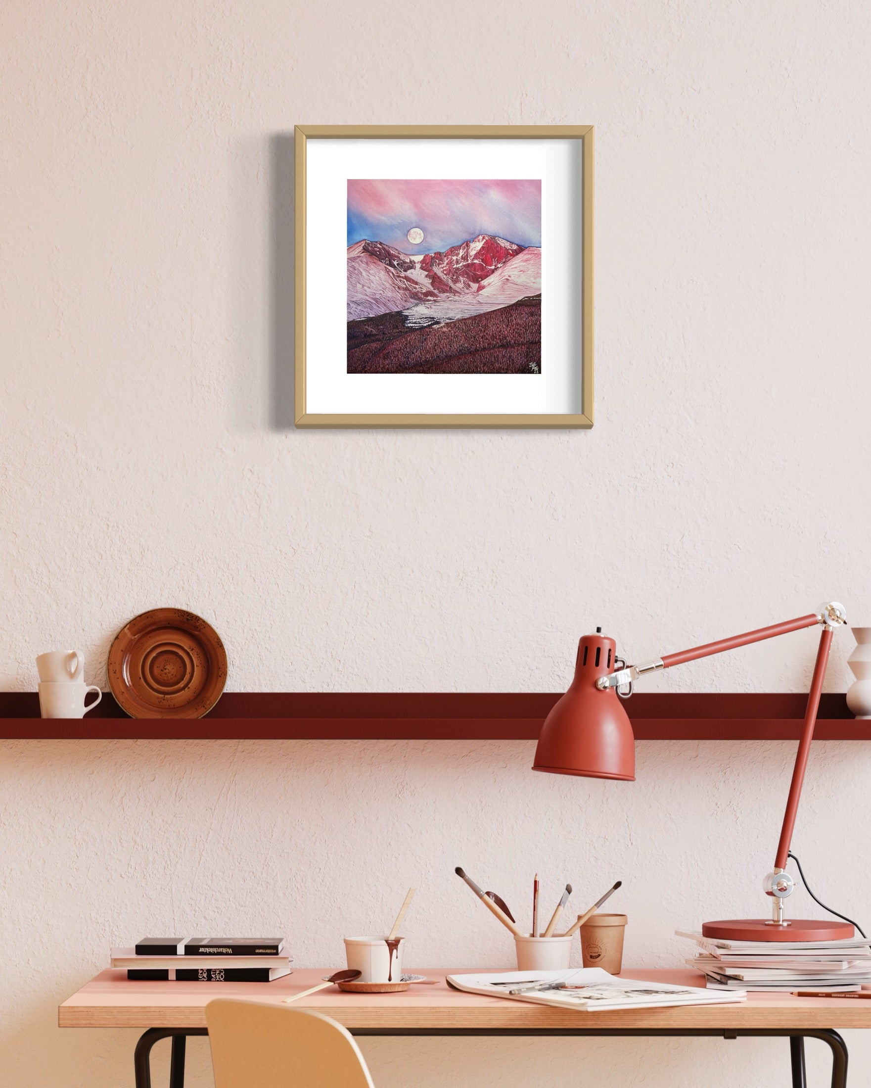 This piece was inspired by the crisp winter mornings in Colorado when the sun is starting to rise which creates beautiful shades of pinks and purples on Longs Peak while the moon is still out. Bring home the beauty of Colorado winters to your home today.
