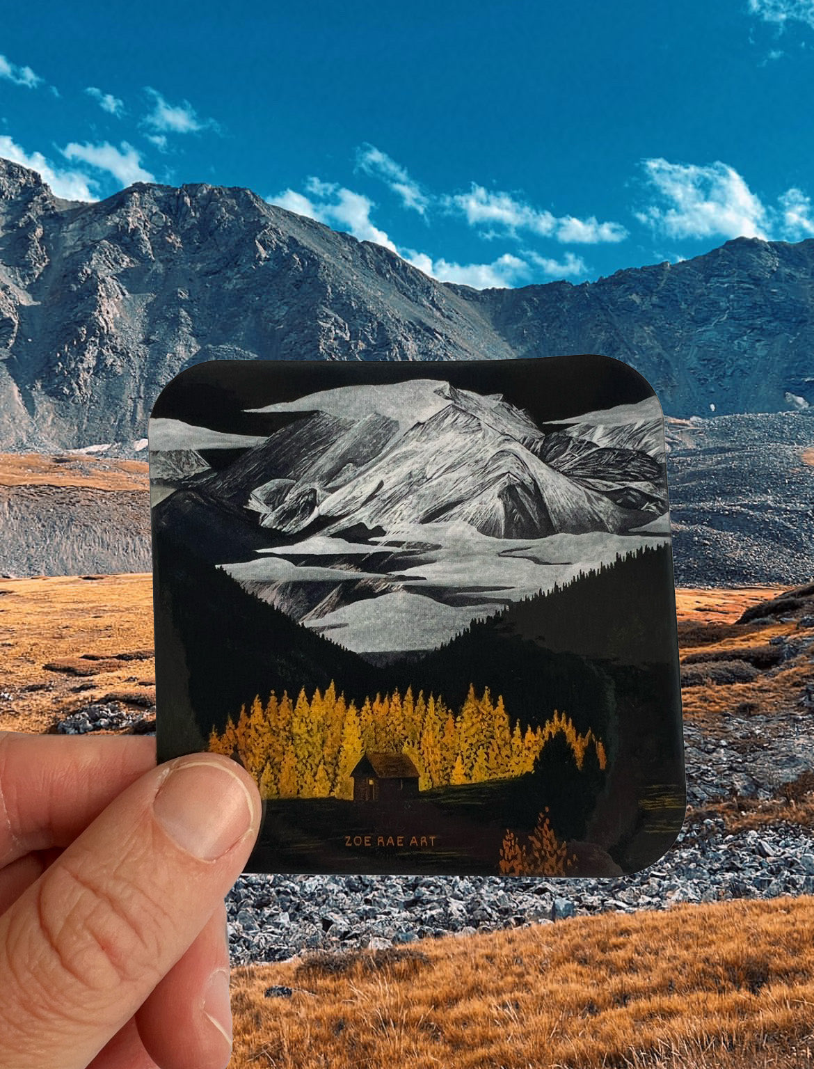 This painting was inspired by a little cabin in the San Juan Mountains in Colorado. In this painting you can see clouds surrounding the snow dusted San Juan mountains. The cabin appears to be glowing from inside due to the colorful aspen trees behind it. Bring home Colorado autumn to your laptop, car, water bottle, or sketchbook.